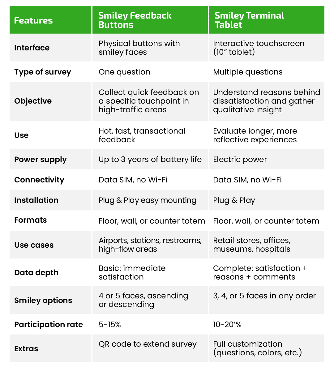 Regarding participation, both formats outperform online surveys, reaching very high rates: around 25% for Smiley Feedback Buttons and 15% for Smiley Terminal Tablets, depending on the sector and environment. They also differ in data depth: while buttons offer basic immediate satisfaction data, touchscreens reveal the reasons behind each rating and collect qualitative insights.